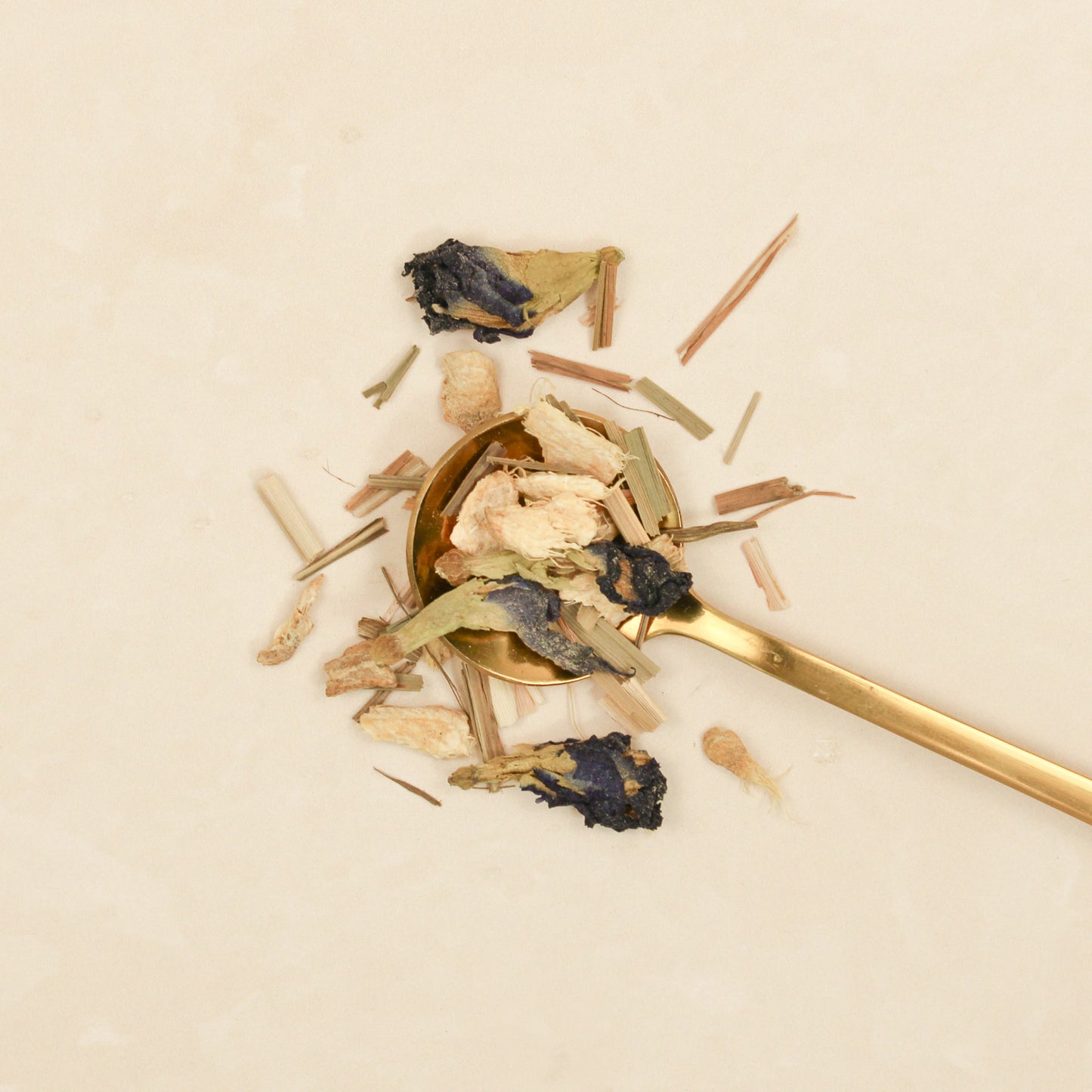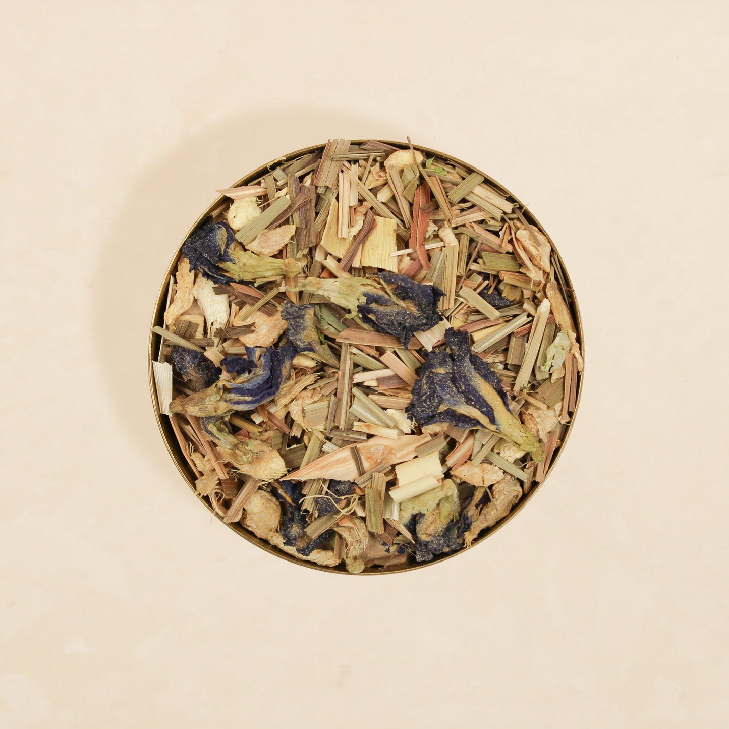 A vibrant blue tea flavoured with butterfly pea flower and ginger.