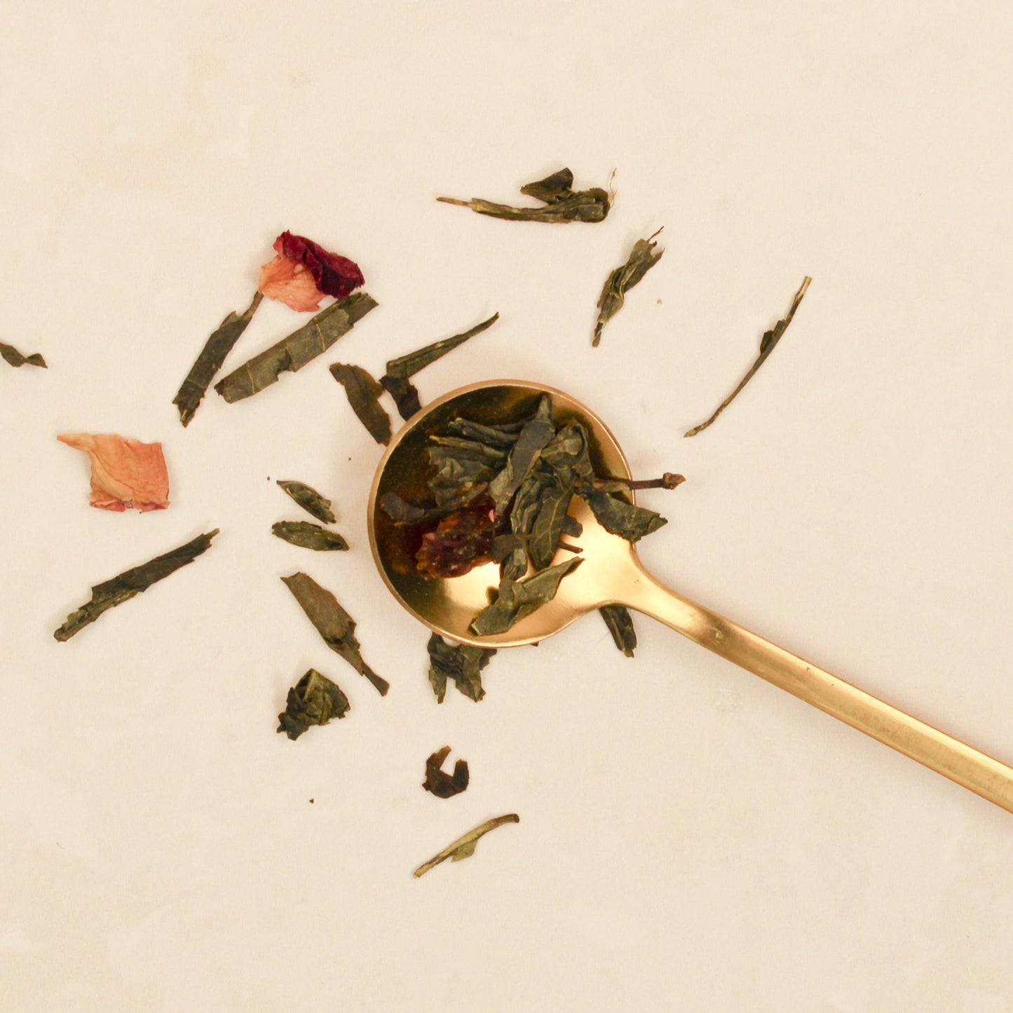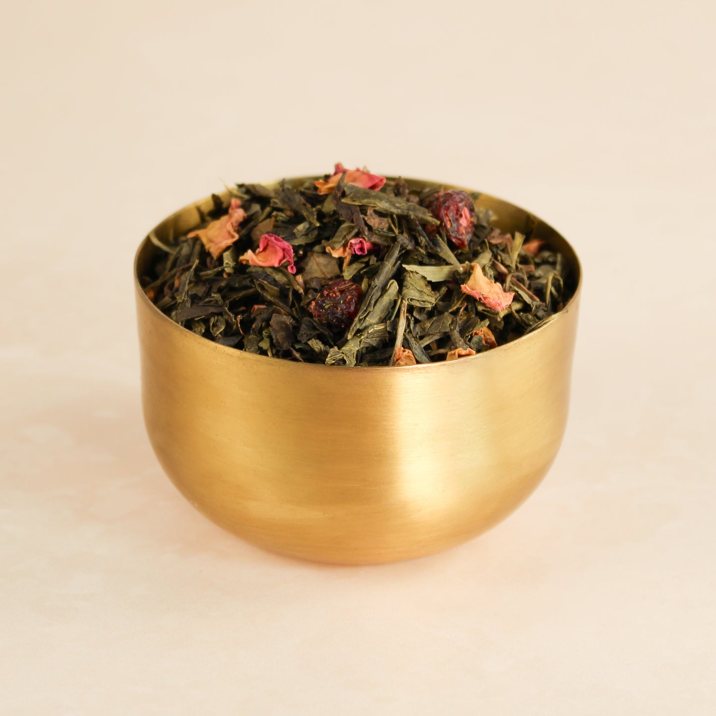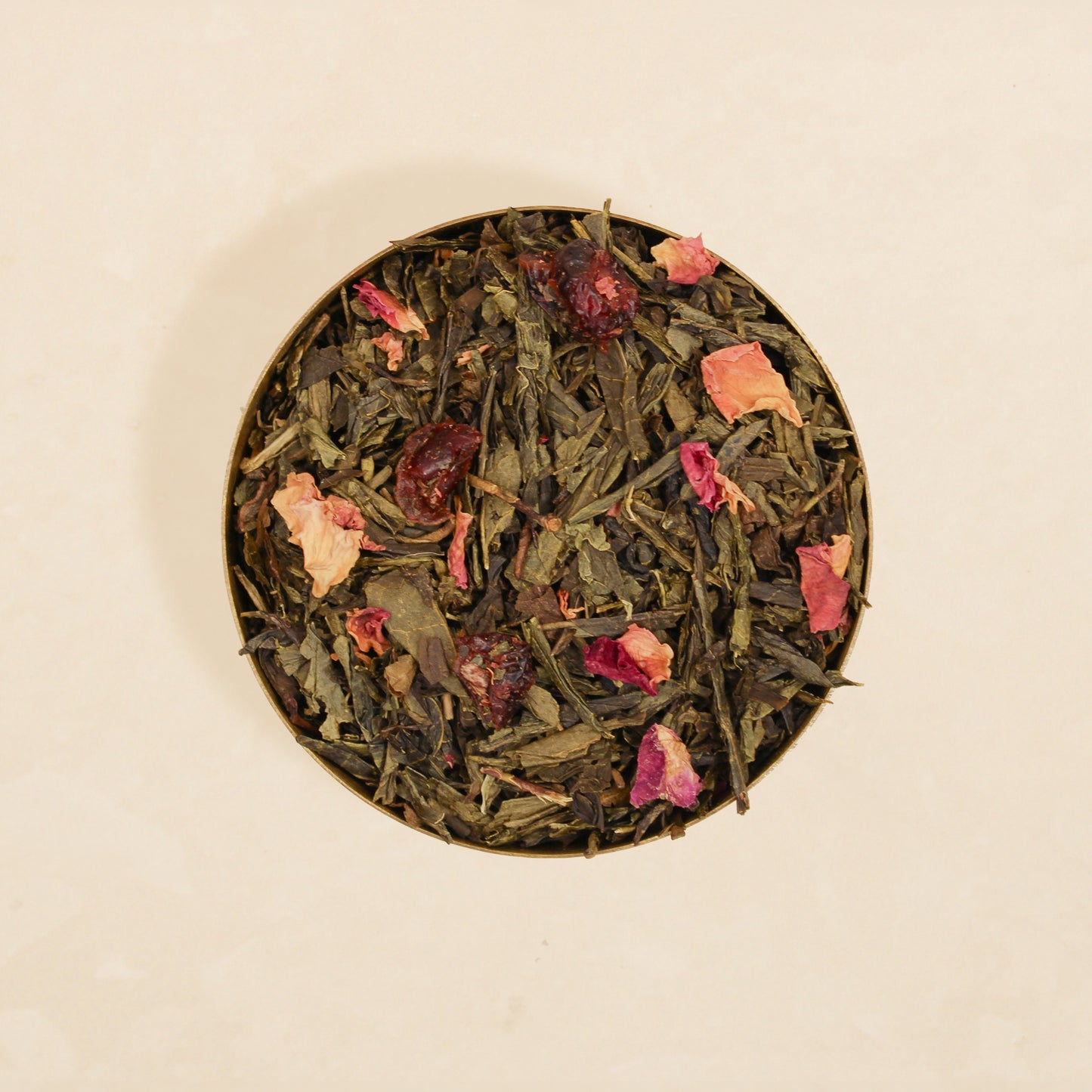 A soft and rosy tea reminiscent of a blooming Sakura tree, Cherry Blossom Green Tea is a sweet blend of smooth and algal green tea, with tart cranberry flavour and pink rose petals - creating a lush and floral cup that looks as beautiful as it tastes.