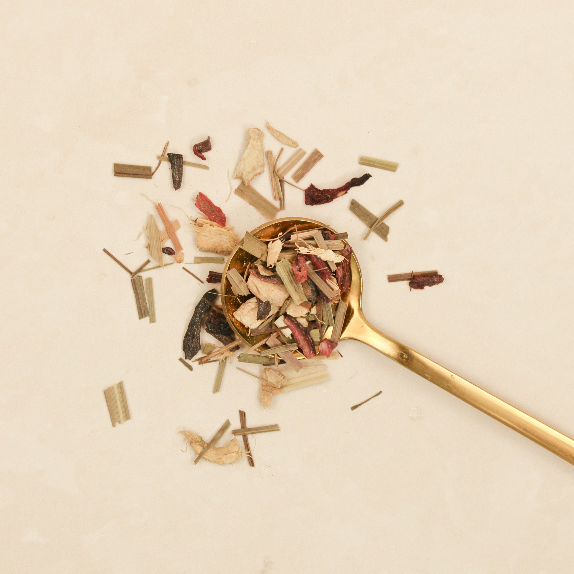 A warm and tangy herbal tisane with ginger, hibiscus, and lemongrass.