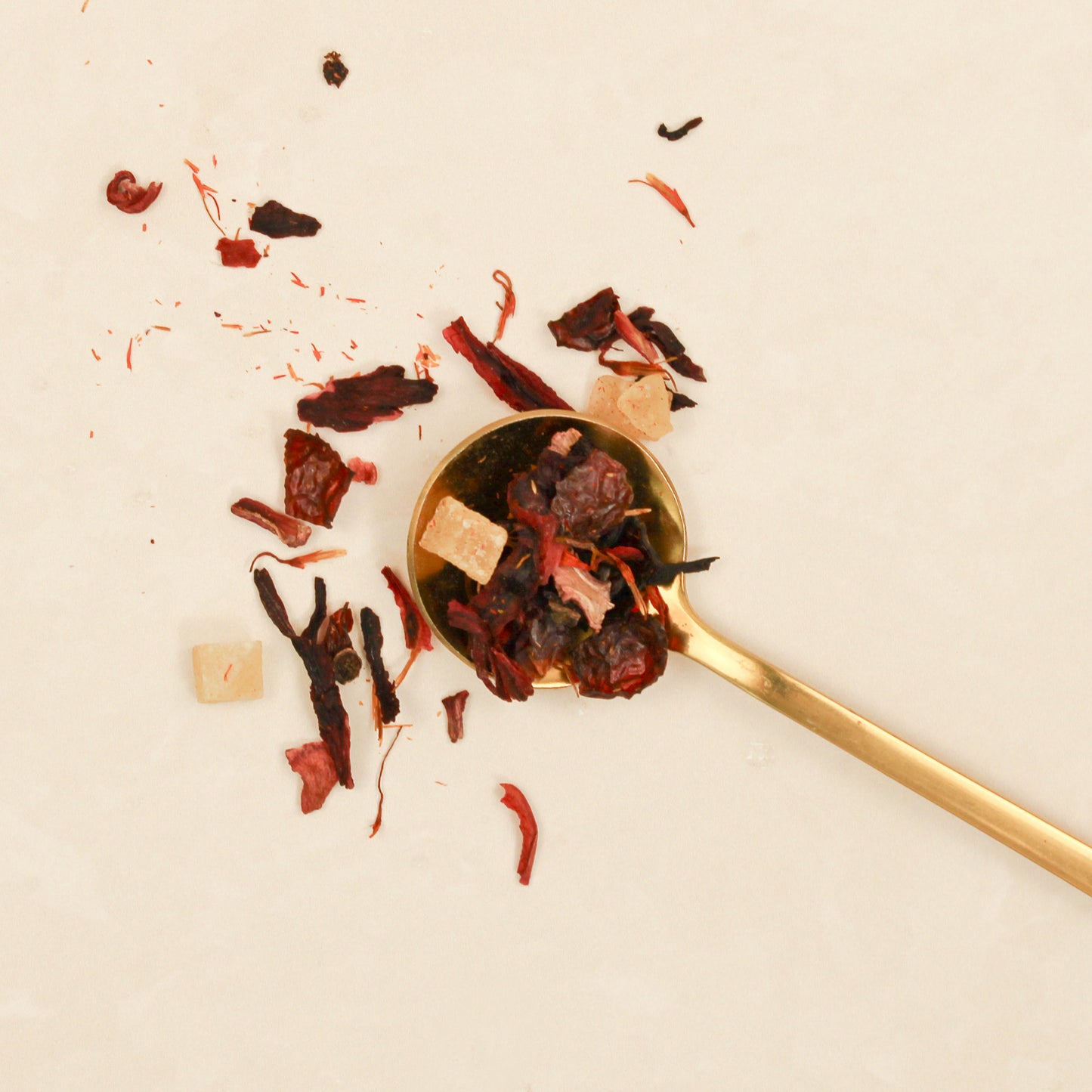 Hibiscus, rosehip, papaya, pineapple, safflower, and flavour.