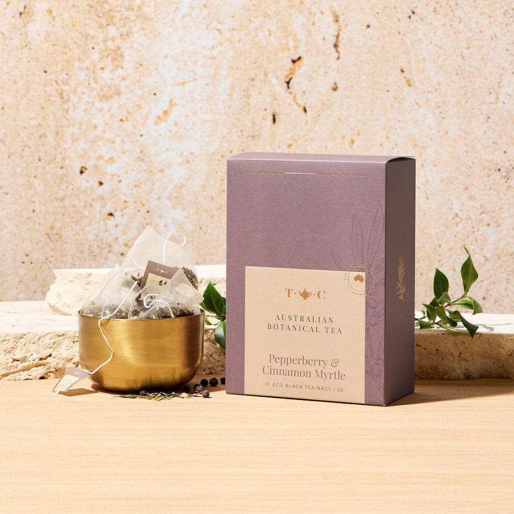 A smattering of sapid pepperberry leaves and cinnamon taste brings out the hidden wild side of this rich black tea blend - a botanical harkening from Tasmania, the ecological Eden that prospers on the edge of the world. Its agrestal mountains boast the cool climate that’s key to growing pepperberry shrubs bursting with antioxidants and flavour.