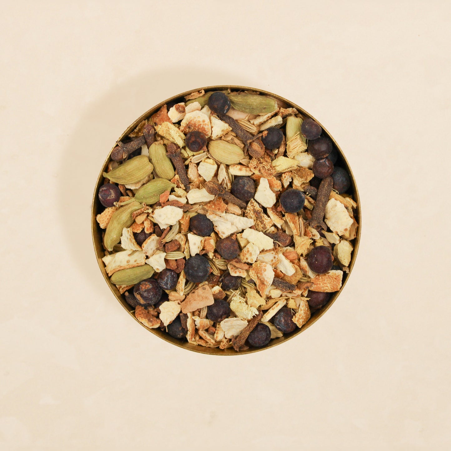 Orange peel, fennel, cinnamon, liquorice, juniper berry, clove, cardamom husk, ginger and green peppercorn.